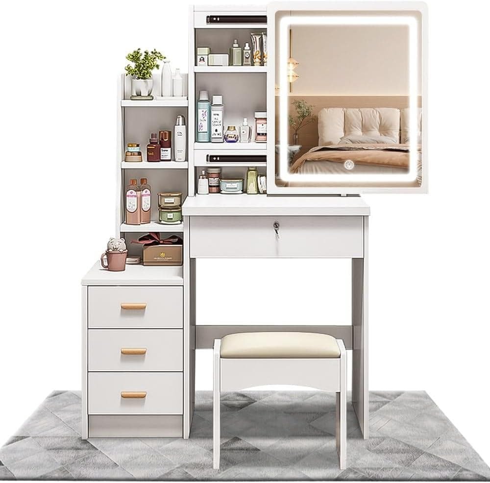 - 自分用のきちんとしたドレッサーを持つのが夢で探していた時にこちらの商品を見つけました。アンティーク調のものが好きなので、本体だけでなく椅子のデザインも気に入りました。収納もたくさんあり、購入画面を一緒に見ていた主人もいいねと言ってくれたので購入しました。届いてからは子供たちがデザインと収納に感激してました。引き出しは縦に長い引き出しもあるので、化粧水などがきちんと入る高さです。ドライヤーも鏡の下の収納に入るので助かっています。大事に使いたいと思います。
